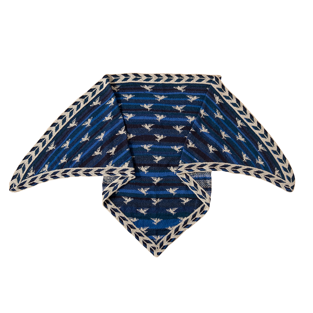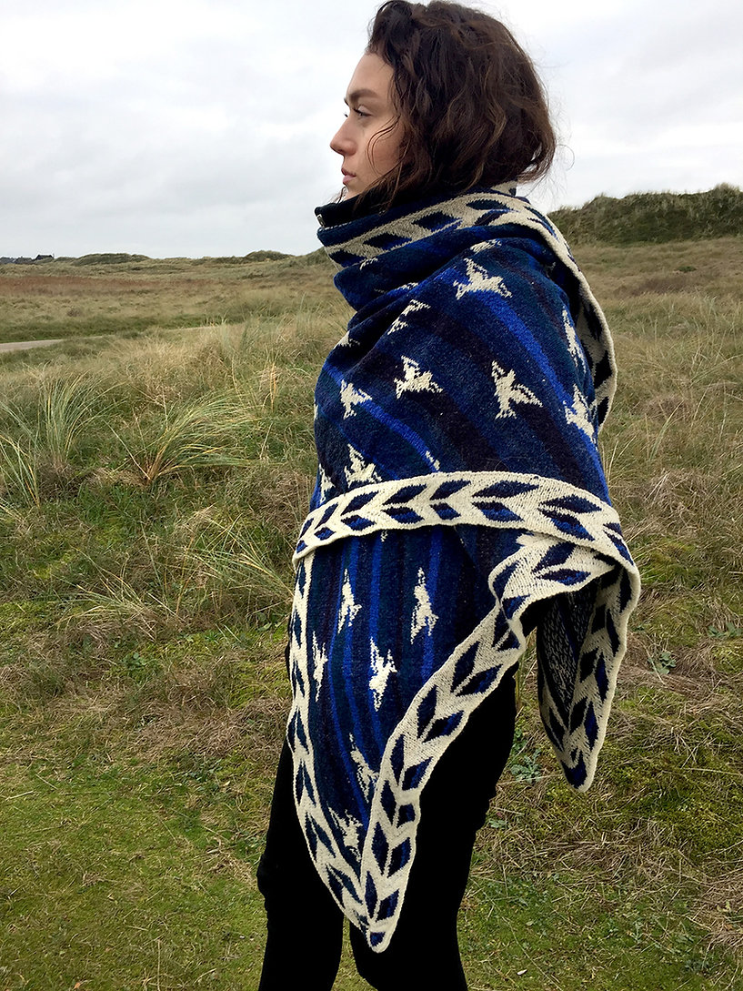 Wenn man wie ich auf der westlichsten Insel Dänemarks lebt, ist die Nordsee der ständige Nachbar. Jeden Tag beobachte ich die weißen Vögel am tiefblauen Himmel auf ihrem Weg zu fernen Horizonten. Das ist meine Inspiration für dieses schöne Tuch, das jetzt schon mein Favorit ist.